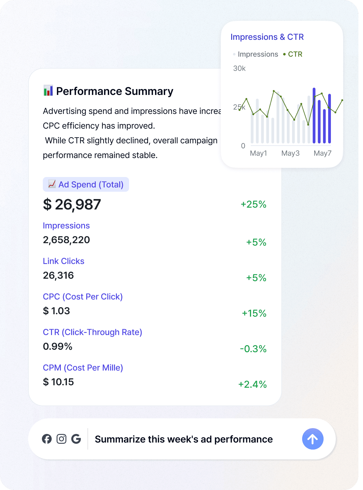 Generate Dashboards Instantly—Just Chat. Save key metrics the way you want–stop repeating the same requests every day.